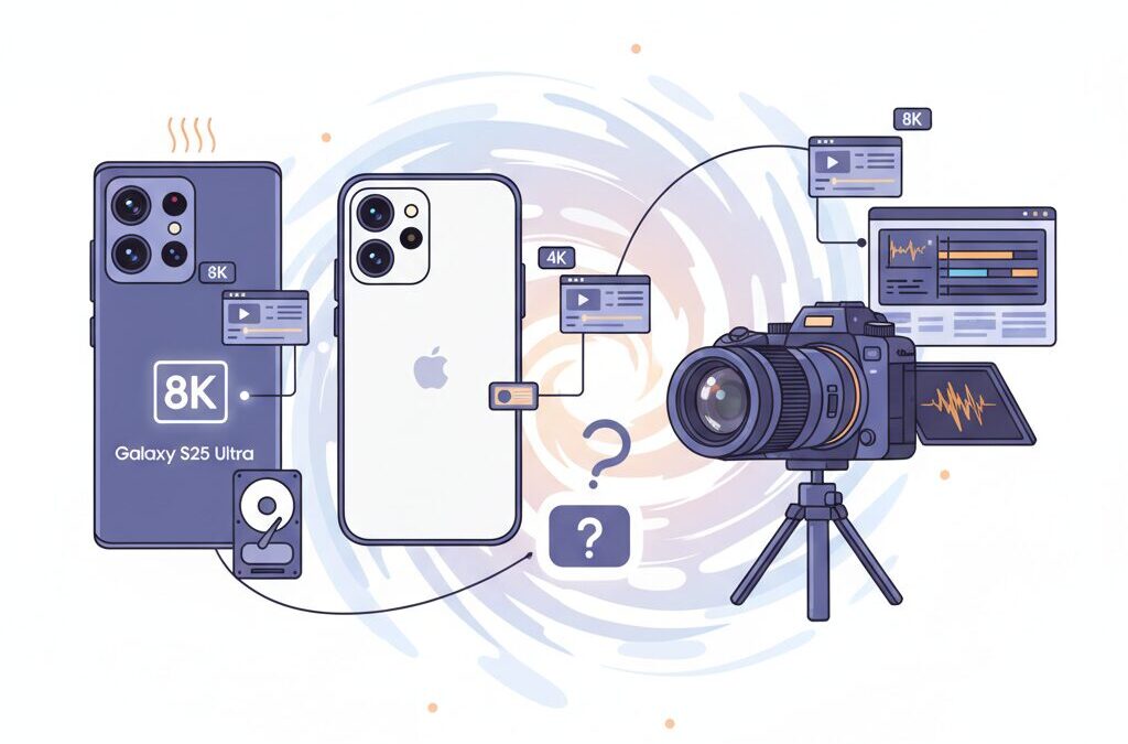8K動画は数年前から一部のスマートフォンや業務機器で撮影自体は可能でしたが、実用化には長らく高い壁がありました。最大の理由は、**8Kが単なる高解像度ではなく、撮影から保存、編集、再生までを含む総合的な負荷の塊だった**ことにあります。特にスマートフォンのような小型デバイスでは、その制約が顕著に表れていました。