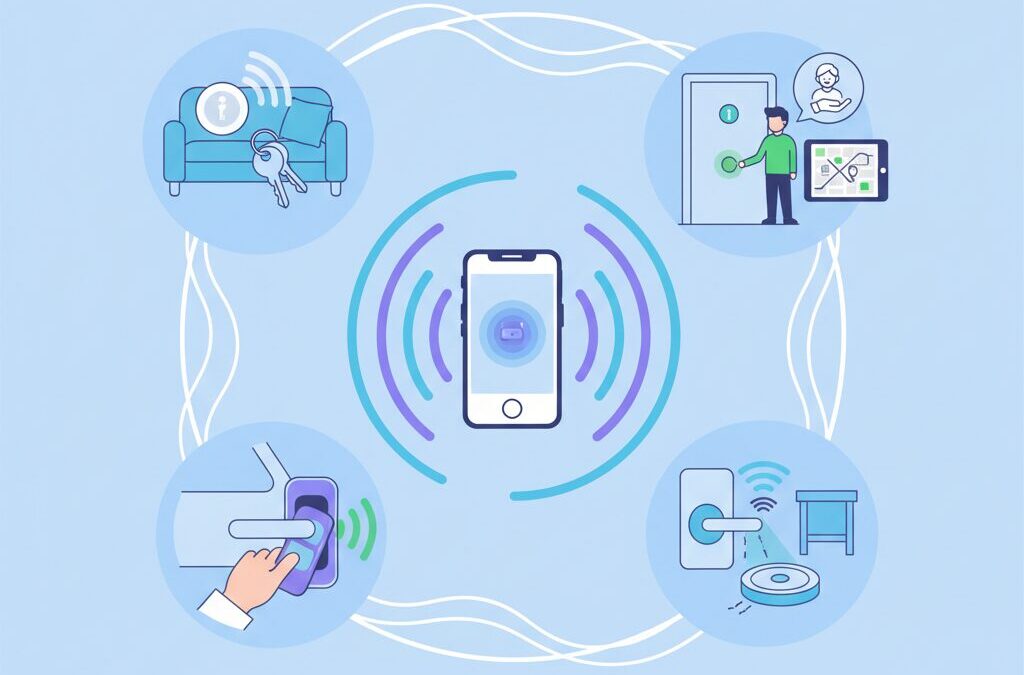 スマートロックと住宅設備の分野では、UWBの導入によって「鍵を持たない」体験が現実的なレベルへと進化しています。従来のBluetoothやGPSを用いた解錠は、便利である一方で誤動作や待ち時間といった課題が残っていました。UWBは数センチ単位の測位精度と方向認識を持つため、玄関前に立ったという明確な空間コンテキストを捉え、意図しない解錠を防ぎながら即座に反応できます。