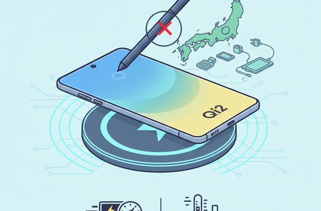 Samsungがこの方式を選んだ最大の理由は、Galaxyシリーズの差別化要素であるSペンとの共存です。SペンはWacomと共同開発したEMR方式を採用しており、微弱な磁界を高精度に検知します。Qi2で用いられる強力な磁石を本体に内蔵すると、磁気干渉によってペン入力が不安定になるリスクが高まることは、SamMobileやAndroid Authorityなど複数の専門メディアが報告しています。Qi2 Readyは、この物理的な衝突を回避するための現実的な落としどころでした。