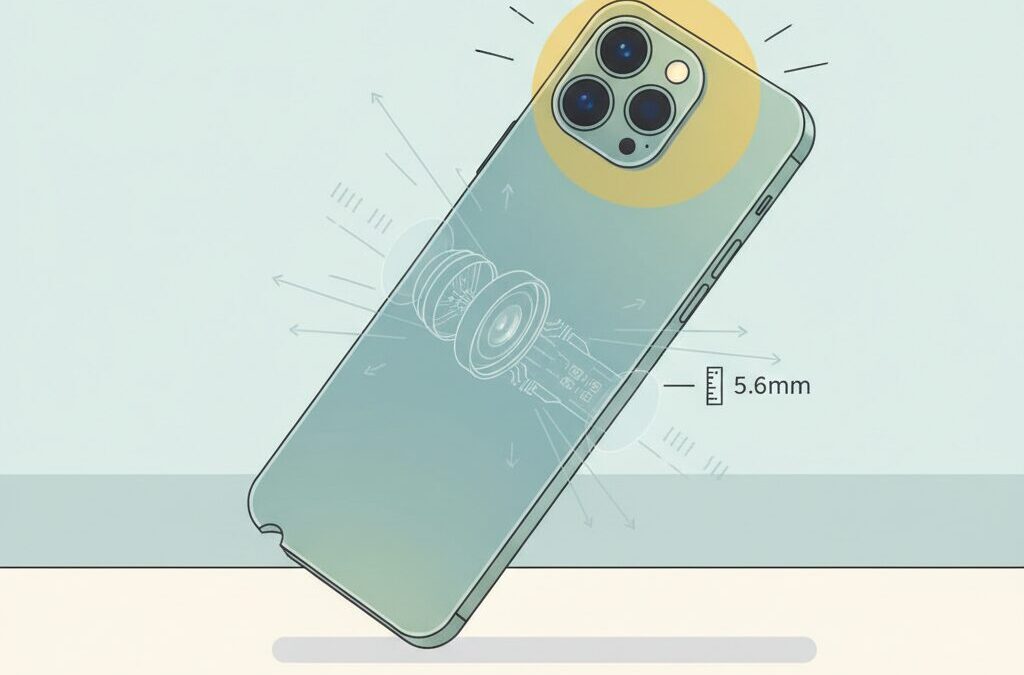 ここで問題になるのが筐体厚との関係です。従来の8mm前後のiPhoneであれば、9mmのカメラモジュールを搭載しても突出は最小限で済みました。しかし、iPhone Airは筐体が約5.6mmまで薄型化されています。この状態で同等の光学性能を維持しようとすれば、**理論上でも3mm以上、実装上は約4mmの突出が不可避**となります。