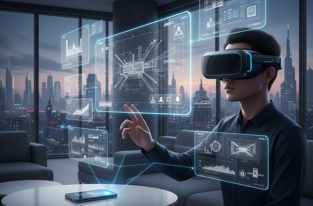 空間コンピューティングとは、**デジタル情報を現実空間そのものに重ね合わせ、三次元的に操作・理解できるようにするコンピューティングの概念**です。従来のPCやスマートフォンは、情報が四角い画面の中に閉じ込められていましたが、空間コンピューティングではその制約が取り払われます。視界の中にウィンドウや映像、データが自然に存在し、視線や手の動き、音声といった人間本来の動作で操作できる点が本質的な違いです。