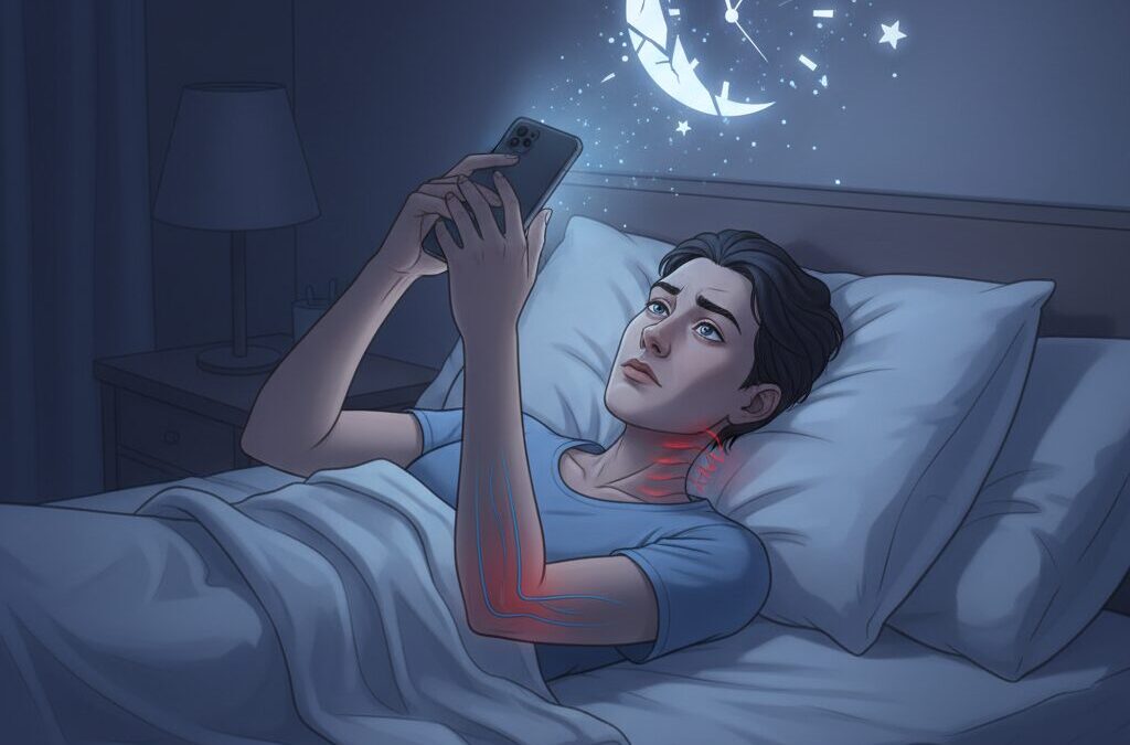 さらに見逃せないのがメンタル面への影響です。オックスフォード大学系ジャーナルに掲載された日本人教員を対象とした研究では、インターネット依存傾向が高いほど首の痛みを訴える割合が高いことが示されています。不安や抑うつ状態は筋緊張を高め、夜間のリラックスを妨げます。すると「気を紛らわせるためのスマホ」が再び選ばれ、悪循環は強化されます。